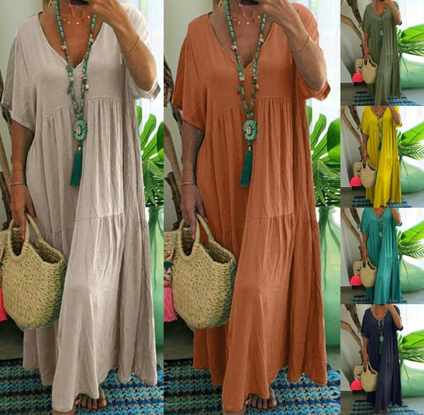✔ Zeitloses Design – Der schlichte Look mit dezentem V-Ausschnitt und fließendem Fall macht das Kleid zu einem wandelbaren Klassiker.