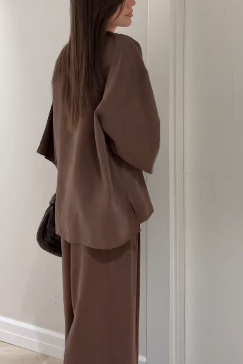 Erleben Sie ultimativen Komfort und mühelosen Stil mit dem Chel | Entspannte Passform, zweiteilig Set! Dieses elegante Zweiteiler-Set ist die perfekte Wahl für alle, die eine harmonische Kombination aus entspanntem Tragegefühl und modischem Design suchen. Es besteht aus einem locker sitzenden Langarm-Top und einer passenden Hose in derselben warmen Farbe, ideal für einen koordinierten und doch entspannten Look. Der fließende Stoff und der weite Schnitt sorgen für maximalen Komfort, während das durchdachte Design eine vielseitige Eleganz ausstrahlt, die sich perfekt für entspannte Tage zu Hause oder stilvolle Ausflüge eignet.