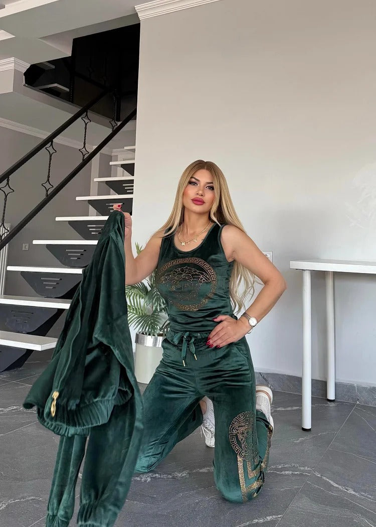 Das Ellie | Bequeme 3-teilige Damen-Sportanzugset – stylisch & funktional vereint Komfort, Stil und Vielseitigkeit in einem modernen Ensemble. Bestehend aus Top, Jacke und Hose bietet es dir die ideale Kombination für Training, Freizeit oder entspannte Tage zu Hause. Mit seinem atmungsaktiven Material und der schmeichelnden Passform ist Ellie dein Must-have für jede Gelegenheit.