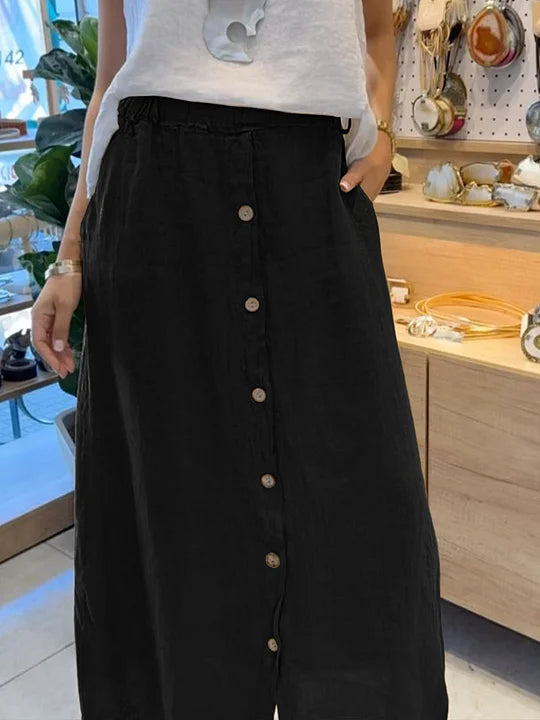 Der Estera | Midirock aus Leinen mit Knopfleiste und Taschen vereint natürlichen Charme mit modernem Design. Ideal für entspannte Tage, Sommerausflüge oder legere Büro-Looks – dieser Midirock sorgt für einen eleganten, aber dennoch bequemen Auftritt.