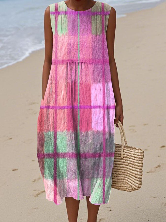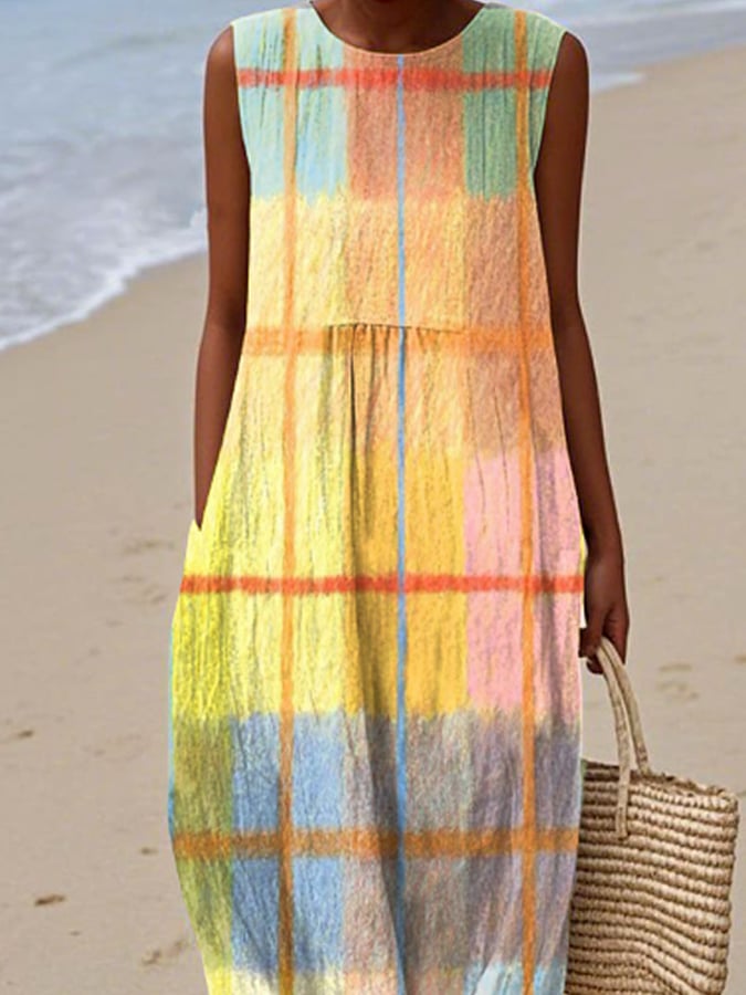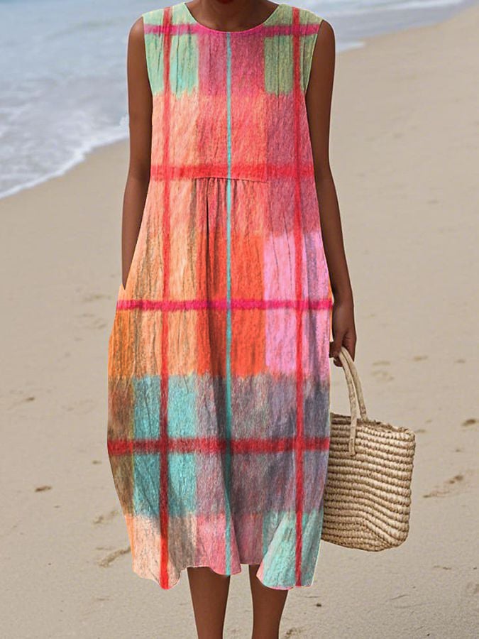 Das Gela | Ärmellose Kleid mit Karomuster überzeugt durch sein zeitloses Muster und den eleganten Schnitt. Perfekt für warme Tage, Freizeit oder besondere Anlässe, bringt es Stil und Komfort in deinen Kleiderschrank.