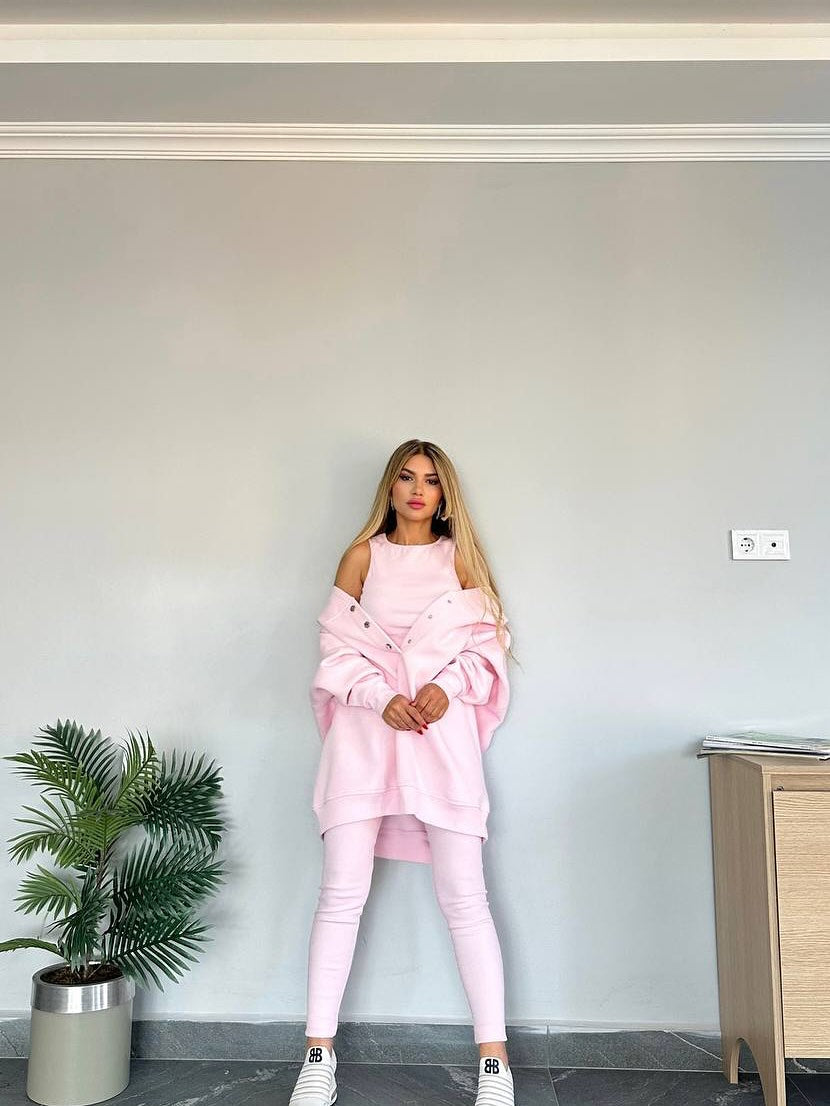 Das Kessa | 3-teiliges Set vereint Stil, Komfort und Funktionalität in einem harmonischen Ensemble. Bestehend aus Oberteil, Hose und passender Jacke ist es die perfekte Wahl für elegante Freizeitlooks oder entspannte Tage mit Stil.