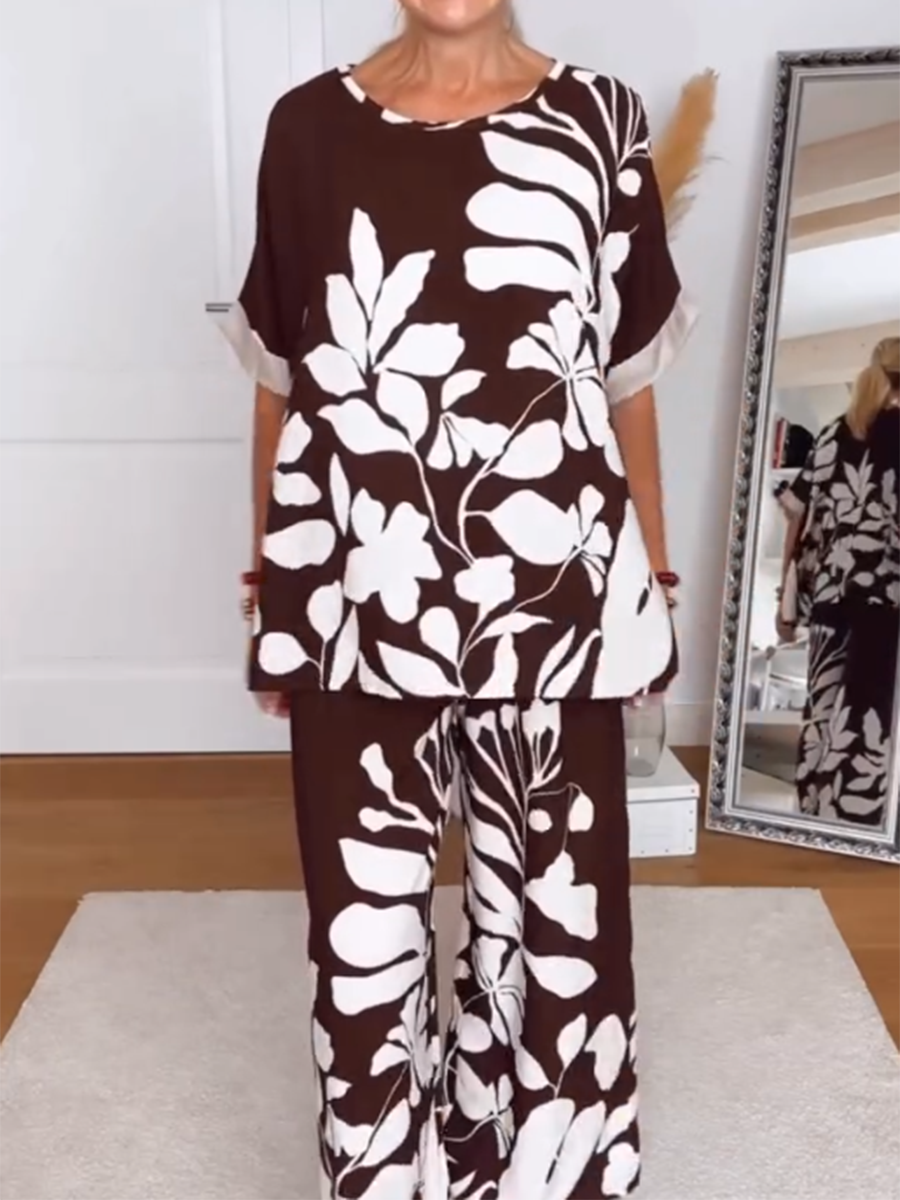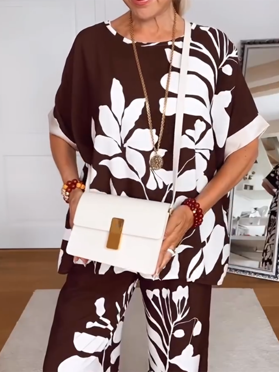 Setze auf luxuriöse Raffinesse mit dem Kit | luxuriösen Damenanzug aus Leinen mit Blumenmuster in warmem Braun. Jetzt bestellen und deinen Look perfektionieren!
