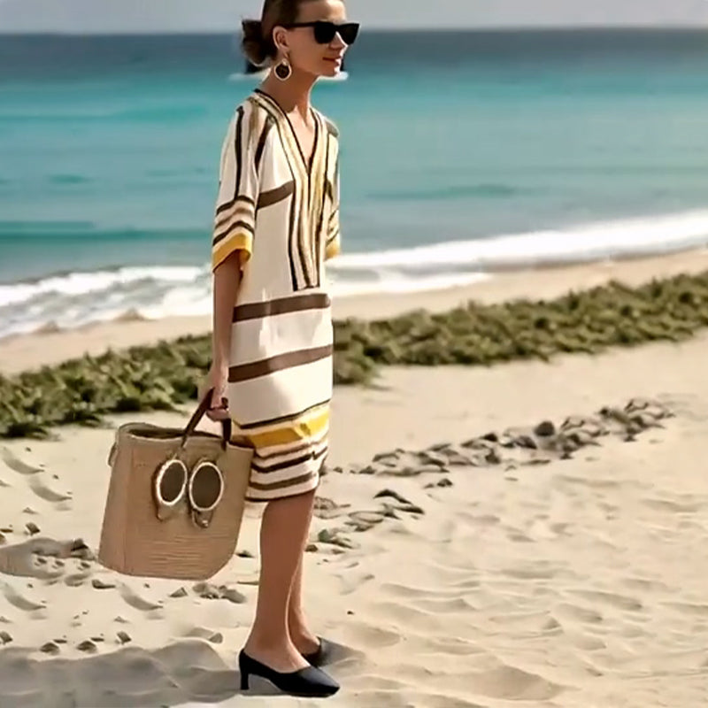 Setze auf stilvolle Raffinesse mit dem Kristen | eleganten Damenkleid mit V-Ausschnitt und Streifenmuster. Jetzt bestellen und deinen Look perfektionieren!