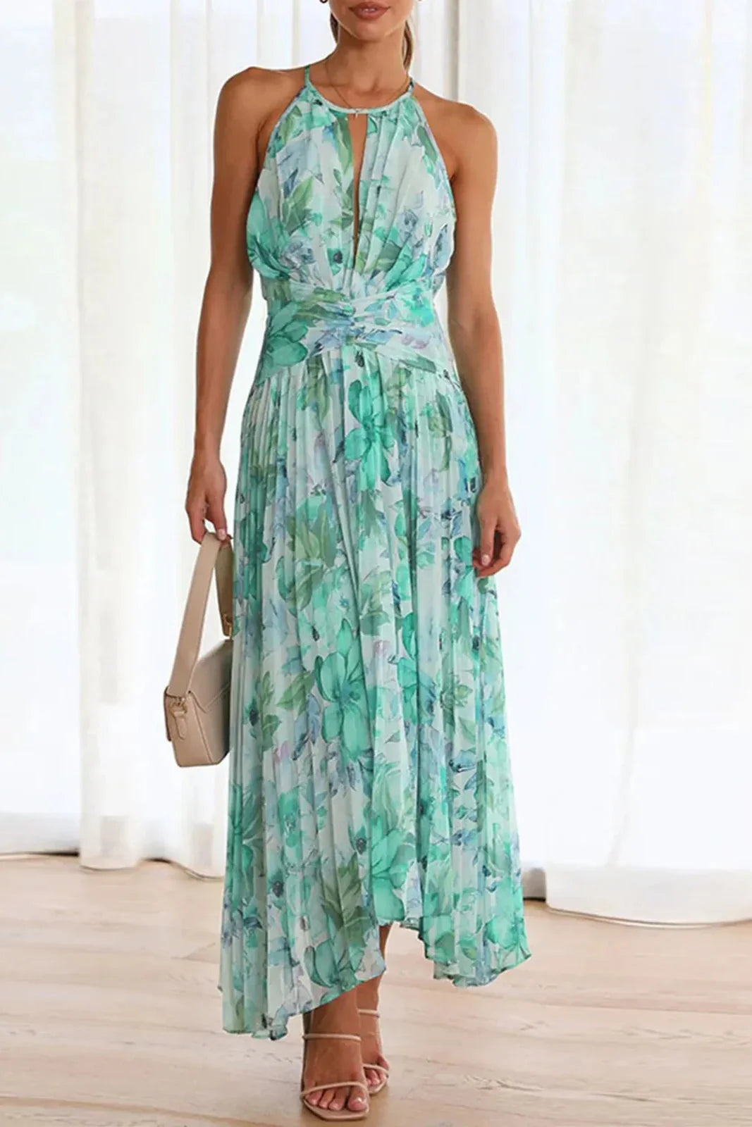 Tauchen Sie ein in sommerliche Eleganz mit dem Rozi | Tropischen Neckholder-Maxikleid. Dieses fließende Kleid besticht durch seinen schmeichelhaften Neckholder-Schnitt und ein wunderschönes, tropisches Blumenmuster in frischen Grün- und Blautönen. Der plissierte Rock fällt sanft und erzeugt eine anmutige Silhouette, die bei jeder Bewegung mitschwingt. Ob für eine Gartenparty, eine Hochzeit oder einen stilvollen Abend im Urlaub – dieses Kleid ist die perfekte Wahl für einen unvergesslichen Auftritt.