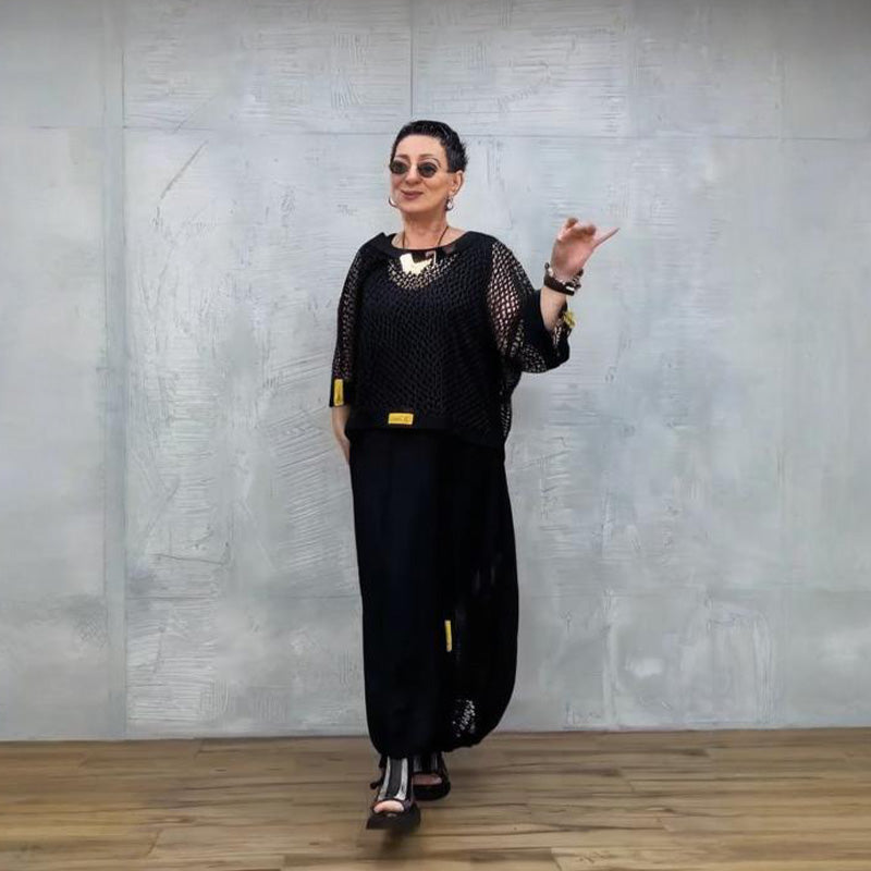 Trendiges Layering – Inneres Kleid und transparenter Stricküberwurf für einen vielschichtigen Look.