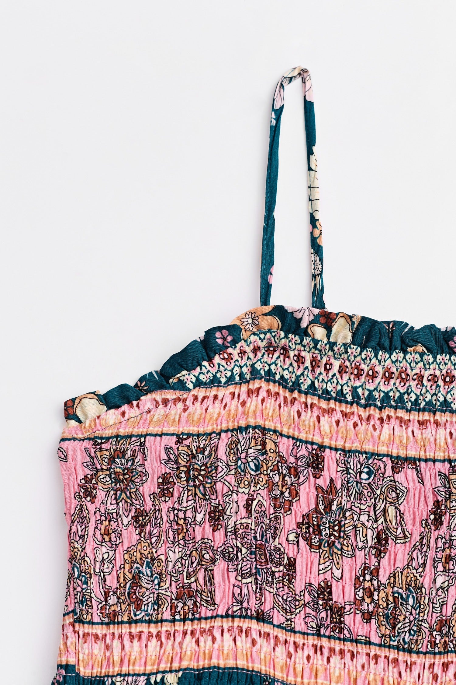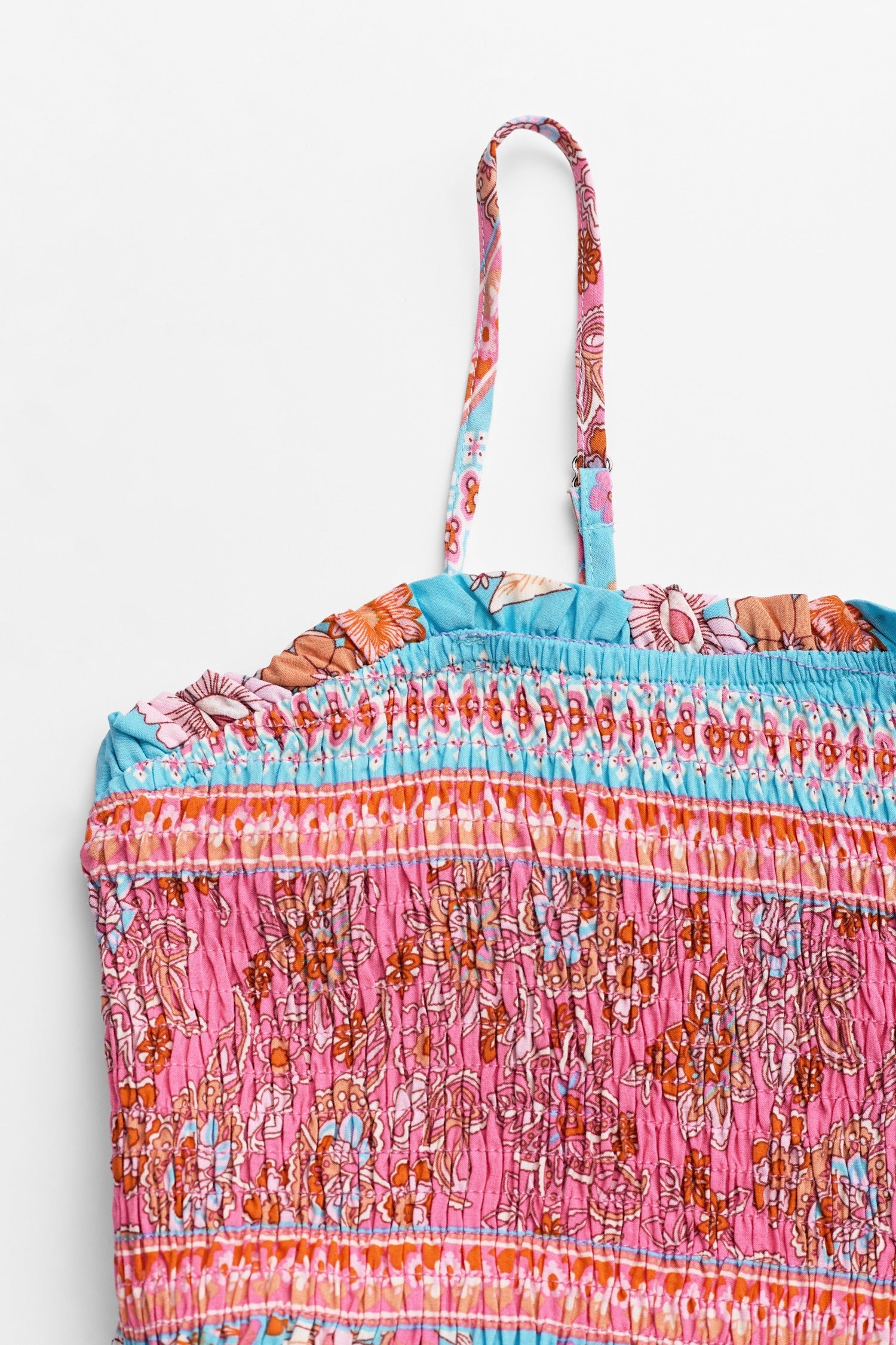 Das Tina | Stilvolles blumiges Maxikleid mit femininer Smokarbeit besticht durch florales Muster und feine Raffung. Perfekt für Sommerfeste, besondere Anlässe oder elegante Freizeitlooks – feminin, leicht und raffiniert.